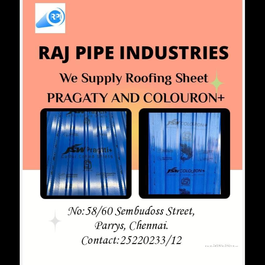 JSW Roofing Sheets Coloron+, Pragati, Radiance, Steel and Silveron+ brands available. 0.47mm & 0.5mm thickness. Sky Blue, Off white, Navy Blue, Mist green, Caulifard Green, Pencil grey and bar galvalume colors available. 1. Jsw Colouron Sheet price in Chennai. 2. Jsw 0.5mm Sheet price in Chennai. 3. Jsw 0.47mm Sheet price in Chennai.